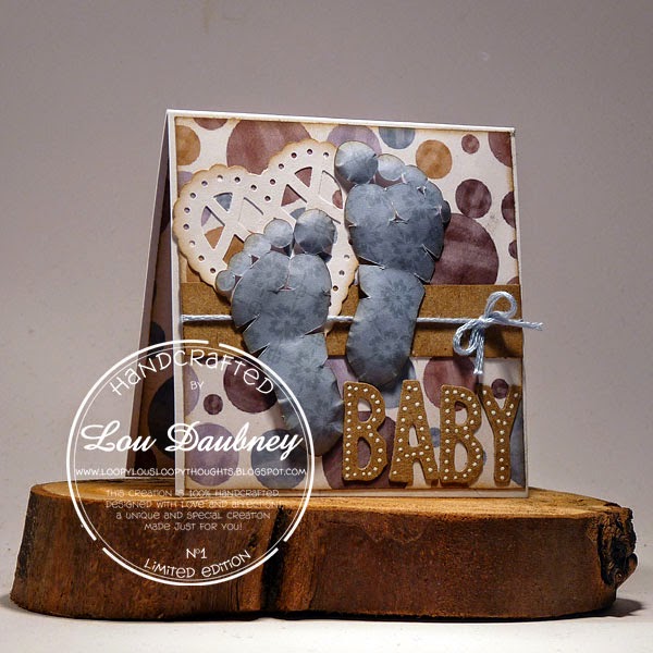 I used my trusty silhouette to cut out the teeny feet for the card in the scraps of paper from my make I shared on yesterday. I love that blue and brown colour combo (... and its always really handy that all the papers in each colourway match up for use as it stops my brain hurting!! lol!!) a few white gel pen dots on the Baby word and a bit of ink around the edges and it was done!!
